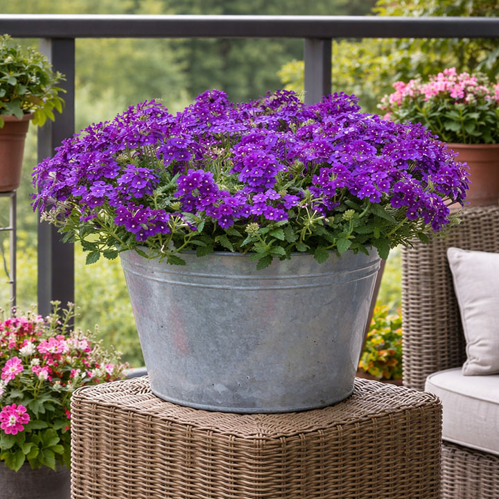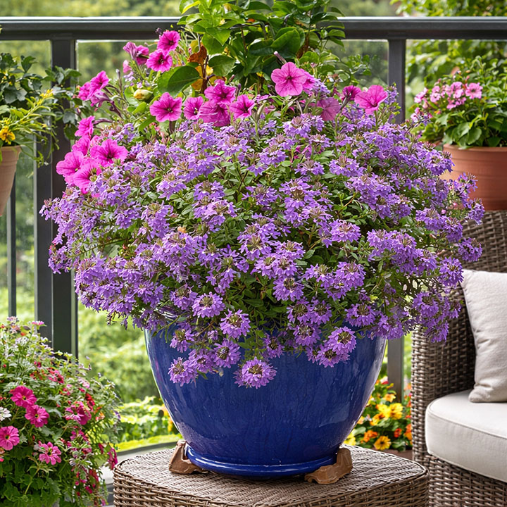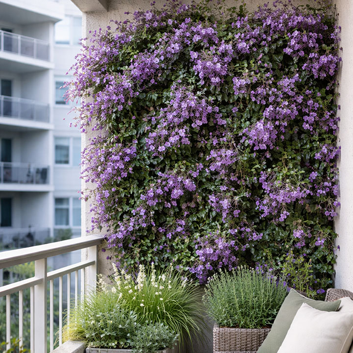 For many balconies, two long ground planters, two or three repeated railing planters, and two to four hanging baskets are enough to create a full effect. Larger balconies can scale this up with the same repeated formula.