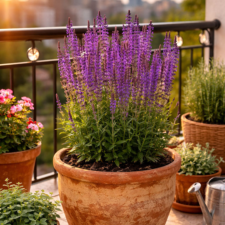 That depends on your climate and the style you want. Mediterranean planting may include rosemary, lavender, olives, and citrus. Native planting may include westringia, lomandra, scaevola, and pigface. Cottage balconies often use roses, salvia, and alyssum, while tropical balconies suit cordylines, philodendrons, and bromeliads.