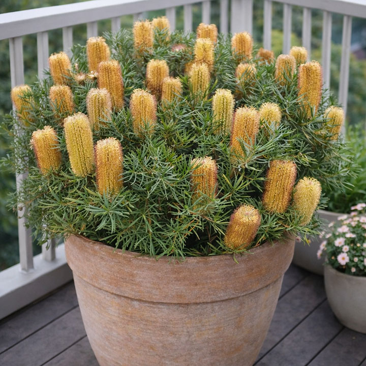 Compact banksias are a great choice for sunny balconies where you want a tougher shrub with standout flowers. Cultivars such as ‘Honey Pots’, ‘Stumpy Gold’, ‘Black Magic’ and ‘Cherry Candles’ are recommended for smaller gardens and containers on patios, verandas and decks. They bring an unmistakably Australian look and are excellent for nectar-feeding birds.