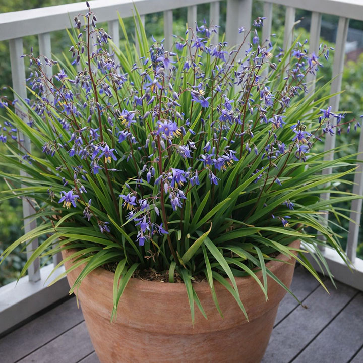 Dianella is a brilliant native strappy plant for balcony gardeners who want strong foliage shape. It forms clumps of upright leaves, produces blue flowers in season, and many dwarf forms work well in planter boxes. It also combines nicely with flowering natives because it gives the arrangement structure year-round.