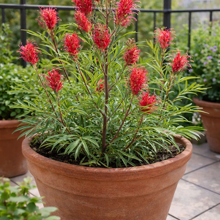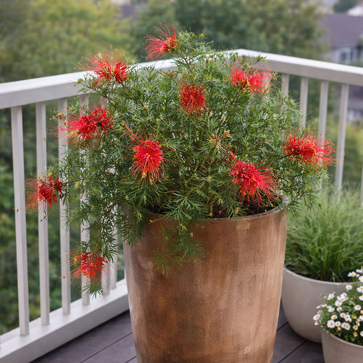If you want flowers, texture and bird life, compact grevilleas are hard to beat. ‘Quick Silver’ performs well as a cascading container specimen for patios or balconies, while ‘Tucker Time Entree’ is specifically noted as a container plant for deck, patio or balcony. Choose smaller cultivars rather than large garden forms so the plant stays in scale with the space.