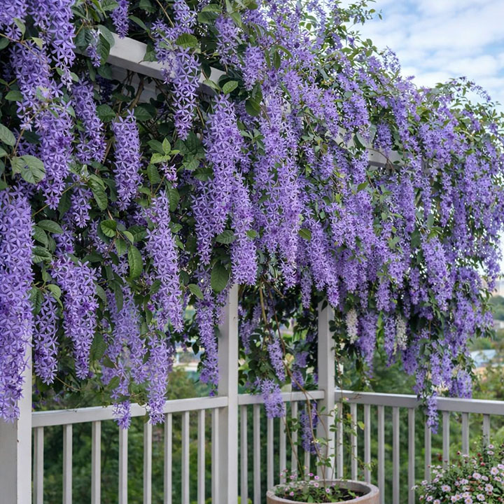 Hardenbergia is one of the standout native climbers for balconies. It produces masses of purple, pink or white pea flowers and can be trained up trellis, along railings or over a privacy screen. Standard forms can climb vigorously, while compact cultivars such as ‘Mini Ha Ha’, ‘Bushy Blue’ and ‘Regent’ are easier to manage in pots.
