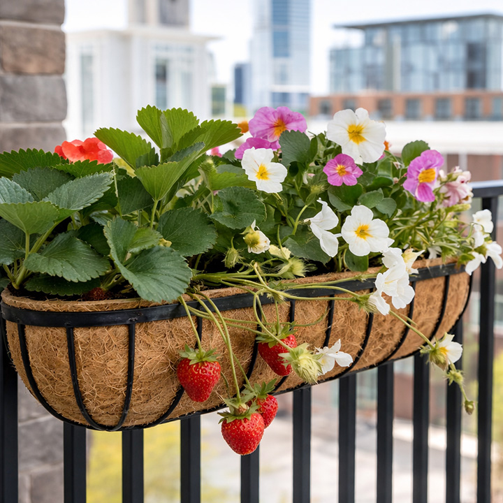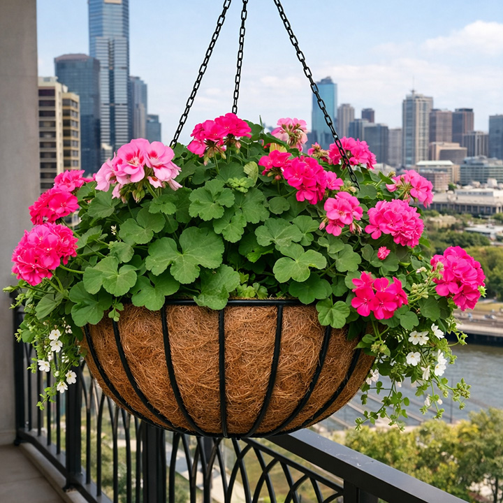This style of hanging basket combines practical planting space with a clean decorative look. It suits both modern balconies and softer garden styles because the black metal frame gives it structure while the coco liner keeps it natural and garden-like.
