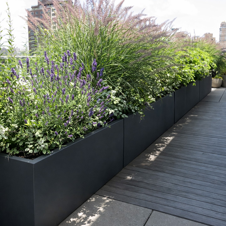 • Ground planters: long charcoal metal troughs for structure and edge planting
