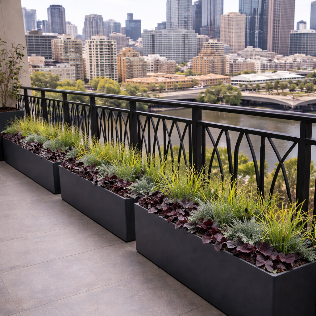 If you want a balcony garden to feel full, polished, and beautifully designed, the best approach is usually not lots of small pots. Small containers can look scattered, dry out quickly, and make even a good balcony feel cluttered. A better solution is to build the space around a coordinated planter system that covers the balcony in a clean and intentional way.