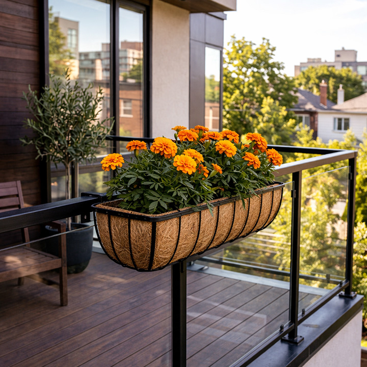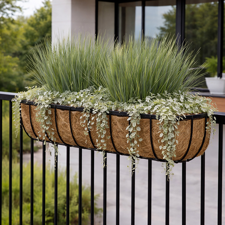 • Railing planters: 36-inch / 91 cm coco-lined railing troughs for a bold planted band across the balcony