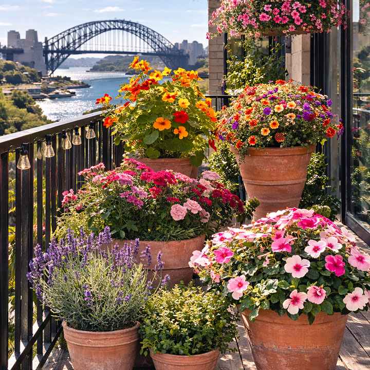 Sydney’s mild winters and warm, humid summers allow a long flowering season. Petunias, geraniums, marigolds, impatiens, begonias, calibrachoa, and lavender all do well. Balconies with intense afternoon heat may need extra watering and more heat-tolerant choices.