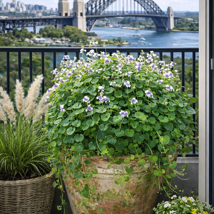 Native violet is a useful low-growing Australian groundcover for wide pots, troughs, and balcony boxes in shade. It creates a soft carpet effect and can produce small purple and white flowers.