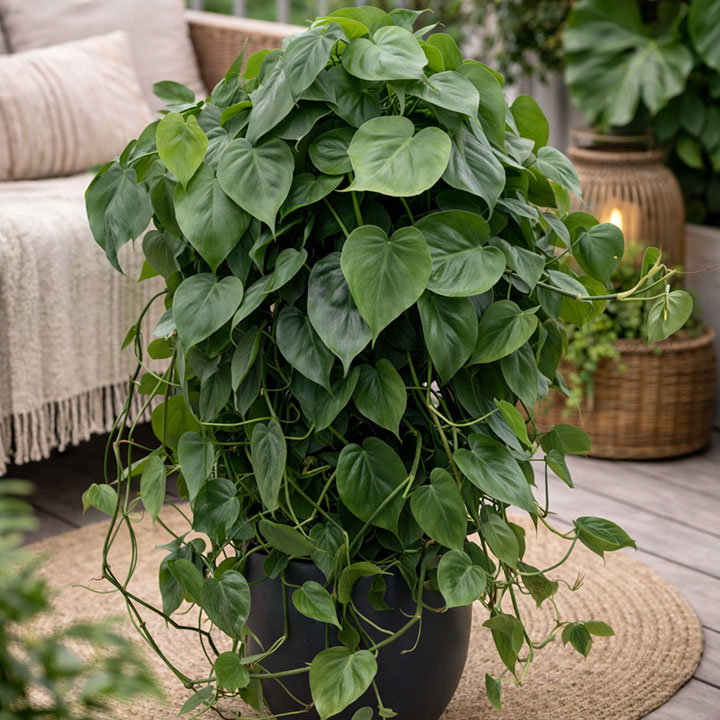 For a modern apartment balcony, it is hard to beat trailing tropical foliage. Philodendrons and pothos thrive in bright shade and bring a lush, cascading look to shelves, railing planters, and hanging pots.