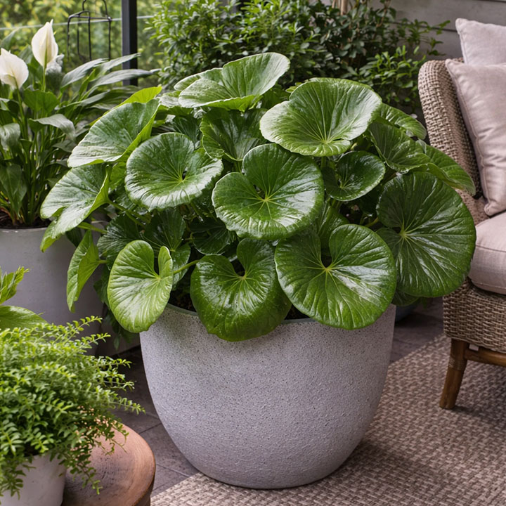 Tractor seat plant is a great choice for a full shade balcony in Australia because it is grown for its large, rounded glossy leaves that create a lush tropical look. It prefers bright shade to full shade and does best in sheltered balcony positions with regular moisture and protection from hot drying winds. Its bold foliage makes a strong statement in pots, especially when paired with ferns, peace lilies, and other shade-loving plants.