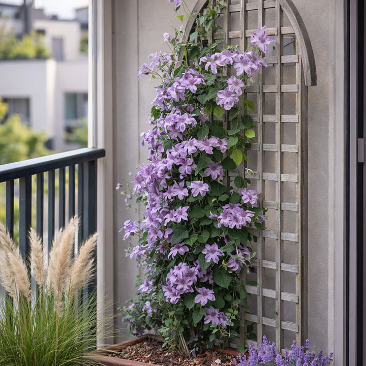 Clematis is ideal if you want a balcony trellis covered in flowers rather than dense foliage. Many varieties grow well in containers as long as the roots are kept cool and the vine gets sun. Choose compact forms for smaller balconies.