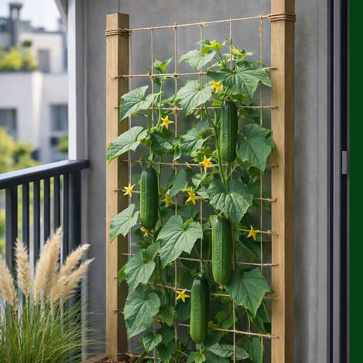 Compact cucumber varieties can do very well on a balcony trellis. Training them vertically improves airflow, keeps fruit cleaner, and saves space. Choose a compact or container-friendly variety rather than a sprawling garden type.
