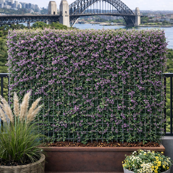 Hardenbergia, also known as native sarsaparilla or happy wanderer, is one of the best Australian native climbers for a balcony trellis. It has purple or white pea flowers and handles Australian conditions well once established. It is especially useful if you want a native planting style.