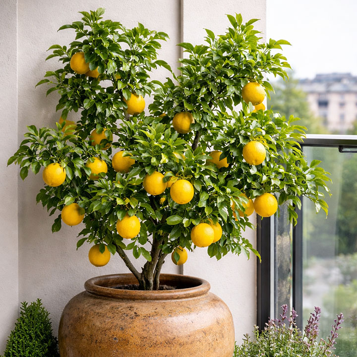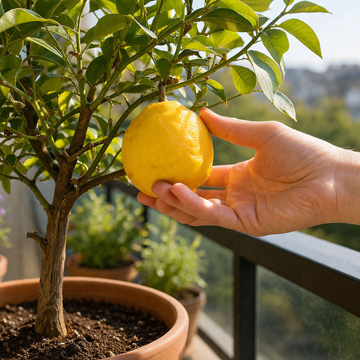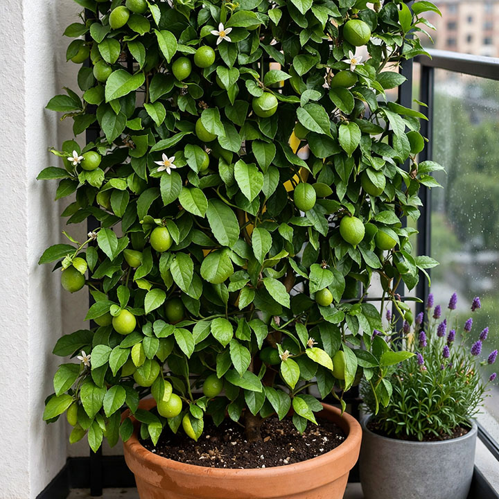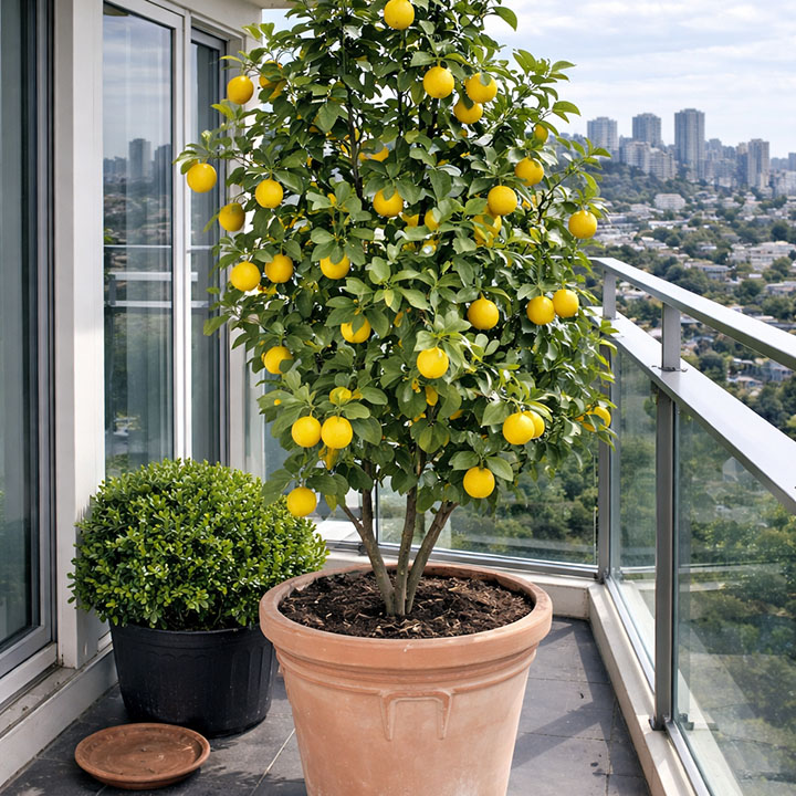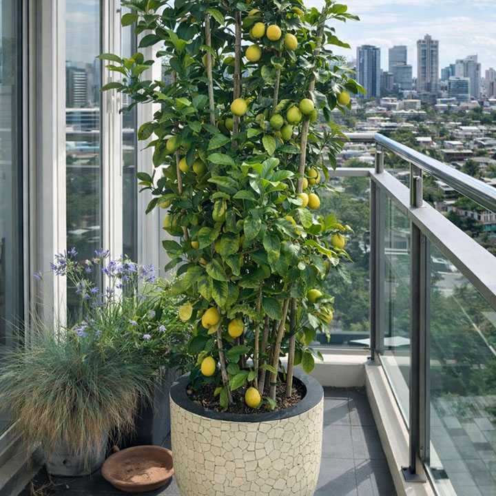 Hot balconies can dry pots very quickly. Deep watering, mulch, and wind buffering can help. Try not to let the tree swing between bone dry and waterlogged.