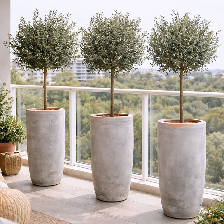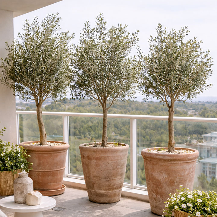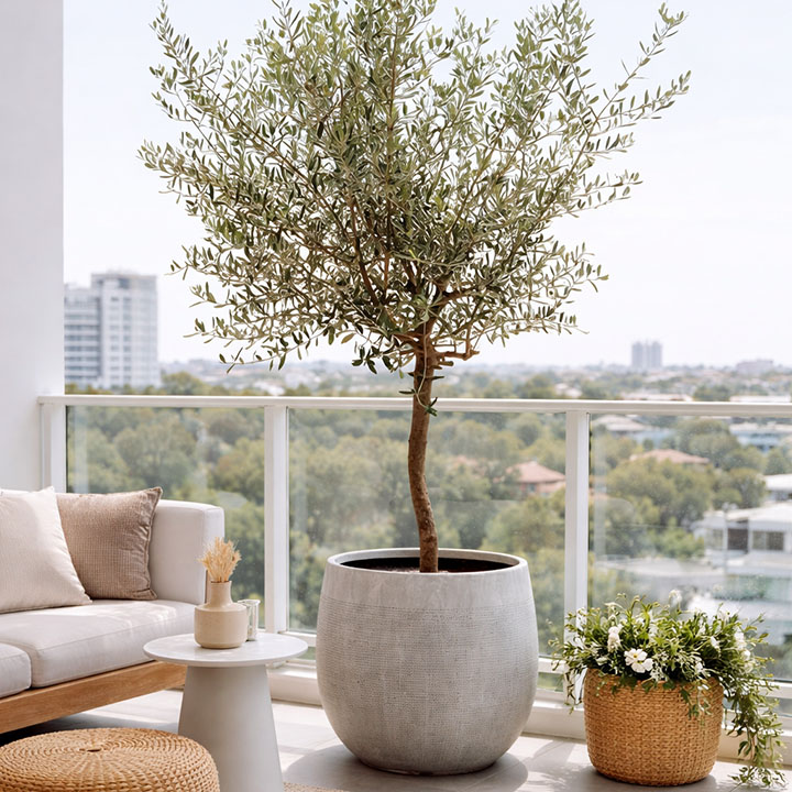 Terracotta looks beautiful and suits olives aesthetically, but it dries out faster. Lightweight composite or plastic pots hold moisture longer and are often easier on balconies where weight matters. Before choosing a very large container, think about load limits, especially on older balconies.