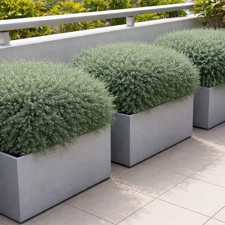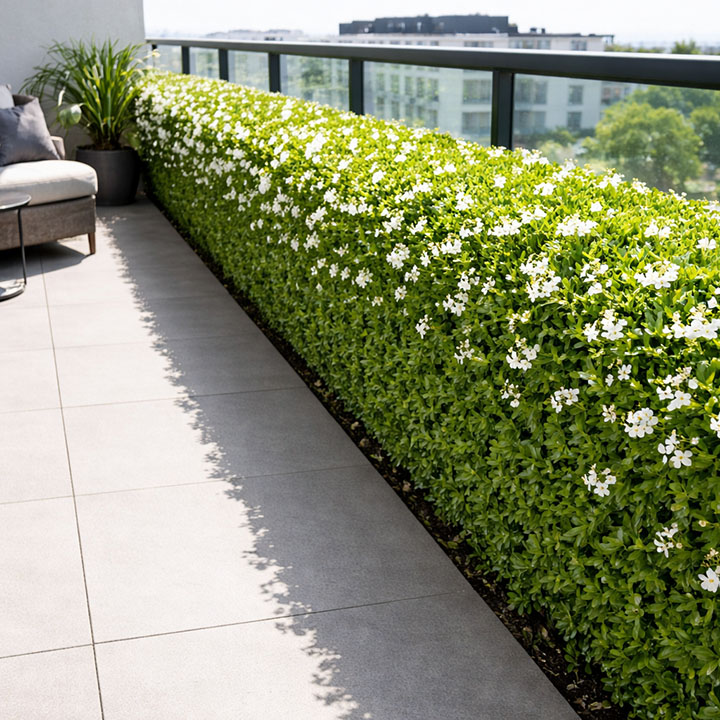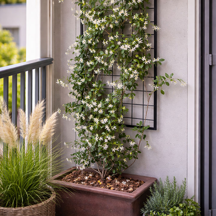 Olive trees are as decorative as they are practical. They pair beautifully with terracotta, gravel, natural timber, white walls, and Mediterranean herbs. A single olive in a large feature pot can anchor the whole balcony. Two matching olives can frame a seating area. Underplanting with thyme, oregano, trailing rosemary, or alyssum can soften the container and make the space feel lush without becoming messy.